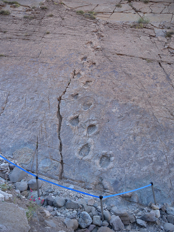 Even na 8 uur vertrok ik zonder ontbijt voor 45 minuten lopen richting het hoger gelegen monument. Ik was de eerste en de onderweg van de bergstruiken grazende paarden keken vreemd op. Daar waren dan de miljoenen jaren oude dinosaurussporen. Echt een hele rare gewaarwording om verschillende achtereenvolgende pootafdrukken te zien tegen een schuin omhoog staande bergwand.