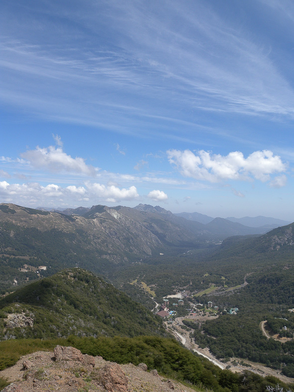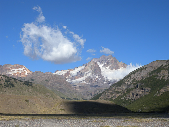 Het pad ging weer naar beneden de andere vallei in. Aan het einde van deze vallei kwamen in het dal meerdere valleien bij elkaar. Hierdoor moest ik veel stijgen en dalen, en via bovenliggende rotsen over de riviertjes aan de overkant komen. Het leverde me behalve zere voeten en schouders ook een prachtig uitzicht op de cordillera (Andes) op: de Argentijnse grens!