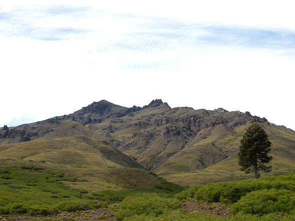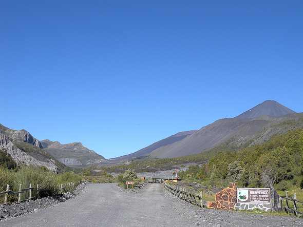 De ingang van p.n. Laguna del Laja; rechts volcán Antuco