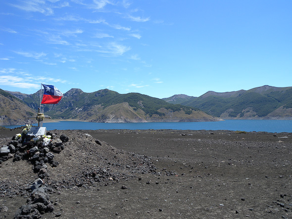 Daarna was het 4 kilometer langzaam stijgend door een bizar lavaveld met wat begroeiing in de vorm van mossen, struiken en een enkele boom die de lavastroom heeft kunnen weerstaan. Na dit pad was daar dan de laguna del Laja. Ontstaan doordat de lavastroom van een uitbarsting in 1873 van de volcan Antuco de achterliggende vallei had afgedamd. Vanaf die tijd stroomde het dal vol en vormde zo het gigantische Laja meer. Een bizarre omgeving door de zwartgrijze Antuco vulkaan en de helblauwe oppervlakte van het water.