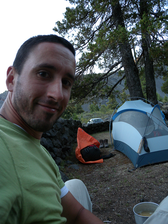 Uiterst ontspannen stond ik op, boterhammetje eten, bakkie koffie maken, nog maar één, wandelingetje naar de verderop gelegen rivier om me op te frissen en uiteindelijk wat van de omgeving verkend. Die omgeving betekende een stukje door het bos, daarna balancerend over het enorme rotsenveld dan wel rivierbedding, en badend door snelstromende, kleine stroompjes. Het ging me allemaal om het spectaculaire uitzicht op de Sierra Veluda: een gigantische piek, bedekt met sneeuw en ijs, en met bijna lichtgevende rotspartijen. Onderweg terug een verhaaltje geschreven en vervolgens naar de "camping" om te eten.