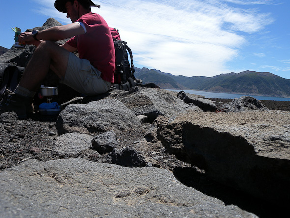 Met nog 10 kilometer te gaan tot aan de plek van bestemming aan de andere kant van de vulkaan, besloot ik wat te gaan eten. Maar om pasta te koken had ik niet voldoende water meer en was ik genoodzaakt om naar de rand van het meer te lopen. Dit betekende 100-en meters door vulkanisch gruis met moeilijk in te schatten afstanden. De omgeving werkte erg desoriënterend, waardoor ik genoodzaakt was om regelmatig om te kijken waar ik vandaan kwam (eyecatcher), en om mijn kompas te gebruiken. Het uitzicht langs de rand van het meer vergoedde veel van de gedane inspanningen. Prachtig!
