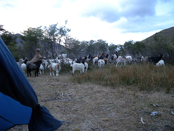 Wel godverdomme! Welke idiote familie haalt het in zijn hoofd om juist dit weekend in deze godvergeten uithoek zijn kampement op te slaan! Inclusief spotlights!!! Natuurlijk werd ik uitgenodigd om bier en wijn te drinken, en tevens een lekker stukje geit te eten. Tsja, daar zeg ik geen nee tegen. Na 2 glaasjes pils, meer dan 2 glaasjes wijn en meer geit met sla en aardappelen, besloot ik te gaan rusten. Ik weet inmiddels wel hoe die Chilenen hun weekend vieren: drinken en eten, harde muziek, zingen en dansen tot in de kleine uurtjes. Ik ben mijn tent niet meer uit geweest en heb tot het einde intens genoten van hun enige echte vakantie.