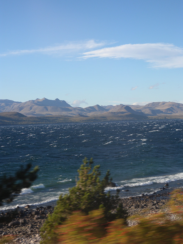 Tijdens de afdaling trok de mist langzaam weg. Voor we het wisten, scheen de zon volop en reden we in volle vaart en wind langs het magische lago Nahual Huapi. Dit was de andere kant van de Andes! Ik kon wel foto's blijven maken…
